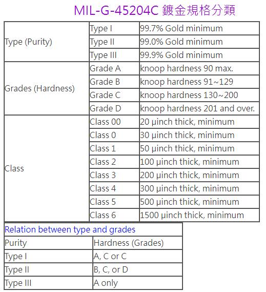 因為一時看不懂,所以翻閱了一些資料,終于發(fā)現(xiàn)這個規(guī)格原來是規(guī)定鍍金的純度(Type 3, 金的含量99.9%以上 )與硬度等級(Grade A, 努普硬度90以上)。