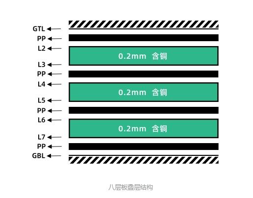 在制作假八層PCB板時,會把中間的芯板上下的銅箔蝕刻掉(即上圖的L4和L5)成為一個光板,此時的PCB板由于只有六層銅箔,但是依舊是八層板的疊層結(jié)構(gòu),所以被稱為假八層板。當然,假八層板也有另一種情況,有些工程師出于成本和設計考慮,會使用兩層銅箔和PP膠替換中間層的芯板,此時PCB板依舊有八層銅箔,但已經(jīng)不是常規(guī)八層板的疊層結(jié)構(gòu)了,這種情況也叫假八層板。