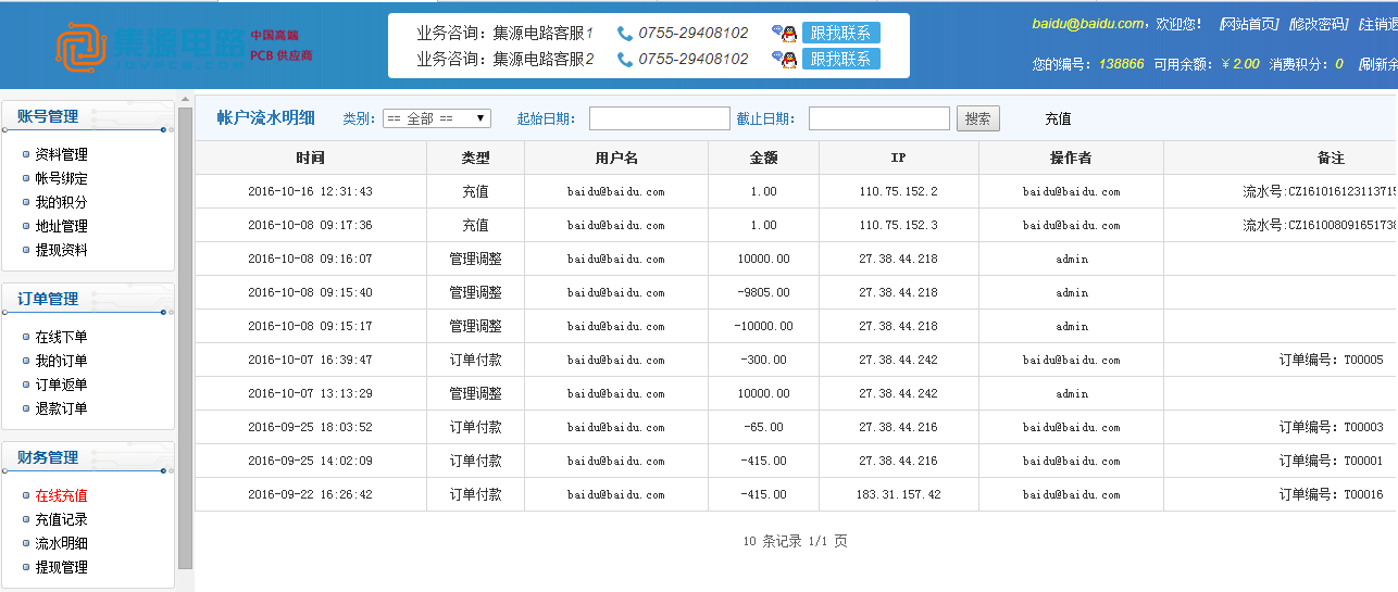 2)查看賬戶充值記錄,點(diǎn)擊財務(wù)管理下【預(yù)存款管理】查看存款充值及消費(fèi)記錄,另還可在登入后臺后右上角也會顯示可用余額